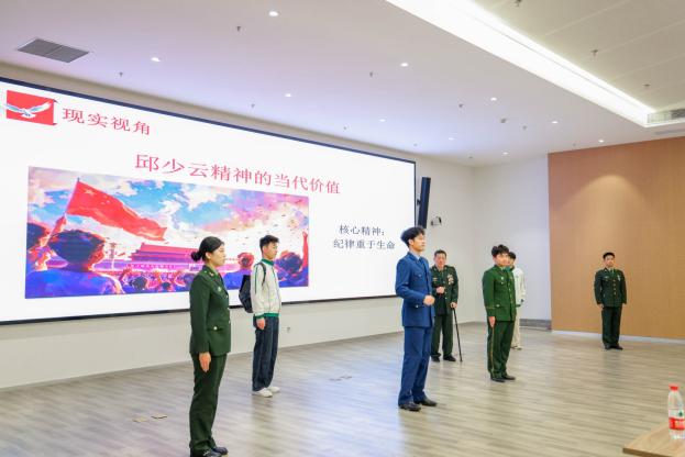 随后,四组银青合作节目依次登场,将活动推向高潮。第一组由浦东军休“红润”宣讲团团长吴建斌与学院退役大学生士兵代表联袂呈现,以“百年变局下的初心力量”为主题,通过情景讲述与史料分享,回顾中国共产党在不同历史时期坚守初心、勇担使命的奋斗历程;第二组聚焦“纠错网络质疑传承烈士精神”,曾参与对越作战的军休干部孙大明结合亲身经历,与退役大学生共同剖析自媒体时代信息纷杂的现状,倡导以理性思维辨别历史真相、以敬畏之心守护英雄事迹,现场响起阵阵共鸣掌声;第三组以“先辈之志我辈当承”为核心,杨浦军休“众鑫有话老兵跟党走”宣讲团副团长刘金亮与现场学生的激情互动,成功再现了革命先辈舍生取义的壮志豪情,号召青年学子将个人理想融入强国强军伟业;第四组“大国长剑青春誓言”则由奉贤军休“红星育苗”宣讲团团长高文山带领退役大学生士兵庄严宣誓,铿锵有力的誓言既彰显了军休干部“退伍不褪色”的赤诚,也传递出青年一代“强国有我”的担当。